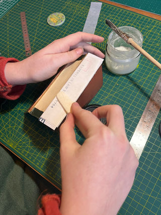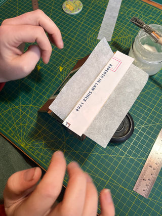 I then laminated section C and used a bone folder to adhere section A to it. I then whipped out the waste paper and, using a ruler and a bone folder, eased a section of Bondina into the, now secured, Kozo tube.