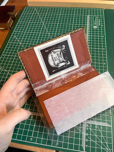 My colleague had advised me that the Kozo strip would be visible and that a further step might be to use acrylic paint, mixed to the shade of the brown end papers, to disguise it. However, although I may decide to do this eventually, at the moment, I rather appreciate the visible repair. The question of whether to restore an object to as close to its original state as possible, or to simply allow it to be functional, is, I know, rather vexed and much discussed. Nonetheless, since this book will only be for my personal use, I believe I will keep the repair visible, since it speaks to the book's history as much as the hand written dedication on the fly leaf and the decorative bookplate on the inside cover.